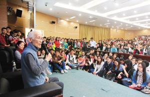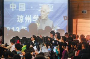 2013年12月31日,余光中在瓊州學院與大學生互動,臺下有不少學生舉起手機“追星”。 李英挺 攝
