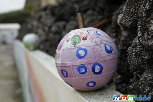 這些小球大小相同,塑料的材質,乍看之下以為是學校報廢的籃球、排球,詢問後得知,這是大陸“送”給澎湖漁民的小禮物,是漂浮在海上的浮球。心靈手巧的小村村民們民發揮創意將一顆顆原本是垃圾的浮球改裝成小區的藝術裝飾品。