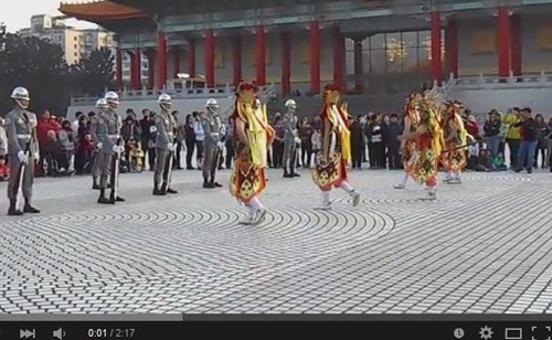 中新網5月13日電 據臺灣聯合新聞網報道,12日網絡流傳一段視頻:臺北中正紀念堂衛兵交接時,遭一群“官將”們“對陣”,吸引許多人圍觀。