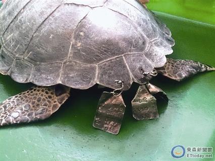 臺灣海生館日前接獲屏東縣海口港港口海巡人員通報,一只綠蠵龜異常出現在岸邊。海生館獸醫師李宗賢表示,綠蠵龜背甲被穿了兩個洞,挂了3塊列了林姓、姚姓、陳姓、王姓、葉姓、胡姓等13個名字的鐵牌,疑似宗教團體放生的祈福牌。