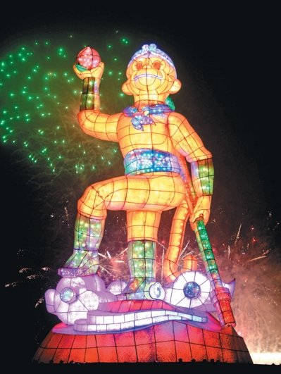 今年燈會主燈以家喻戶曉的齊天大聖孫悟空為主題,用全彩LED光源搭配4D折射模式,營造嶄新的科技風貌,高達26米也是歷年之冠。市府表示,昨晚六個燈區逾130萬人次進出,預估整個展期將吸引1400萬人次觀賞。
