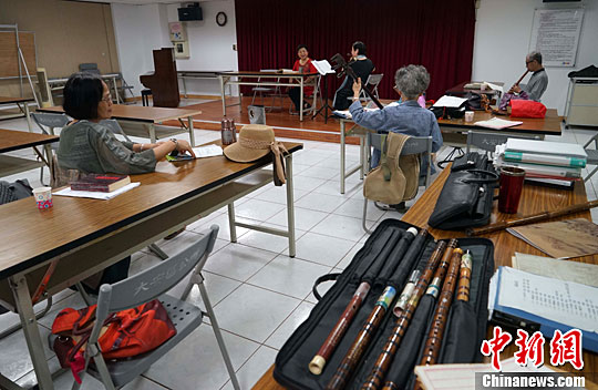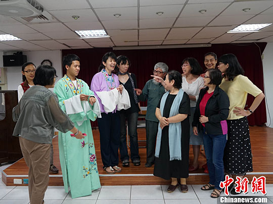 4月10日,臺北大雨,記者慕名而至“蓬瀛曲集”堂會地——大安區民活動中心。這個位于地下室的活動中心,下午1時至5時迎接所有願意參與的曲友,骨幹總是那麼三十來個人。這里實行分攤費用制度,骨幹們每人每年攤上一次承擔主辦活動的機會,每次支付1200元新臺幣。臺北故宮博物院顧問委員會的朱惠良女士是這個曲社的“鐵桿”,每兩周一次聚會幾乎場場不落。她報的曲目是“夜奔”,舞臺上淩厲的眼神勾勒角色的悲憤與慷慨,多年功底在舉手投足間流露。