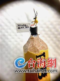 陳逢顯的雕刻“追求一毫米”,他被臺媒譽為“臺灣微雕第一人”,曾創作出世界上最小的猴子、熊貓、羊、紫砂壺等,均以毫米計。