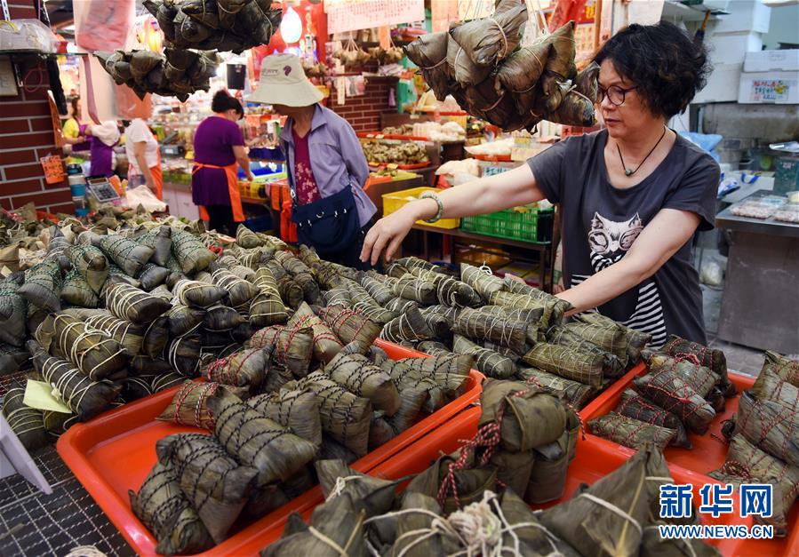 6月6日,市民購買粽子準備過端午節。端午節將至,名粽集散地臺北市南門市場粽子飄香,店家推出豆沙、蓮蓉、蝦米、蛋黃等不同餡料的粽子30多種。 新華社發(吳景騰 攝)