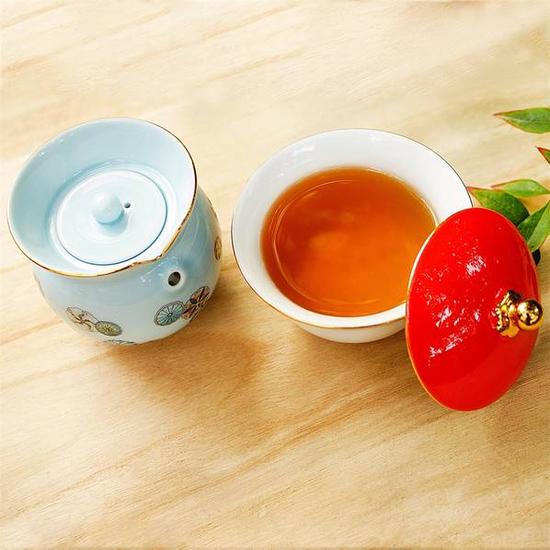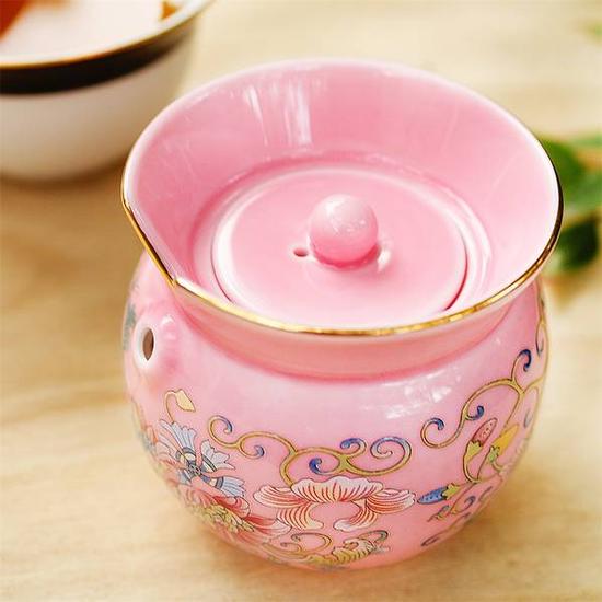 “小乾隆”透過擬人化的造型,巧妙地將壺、杯、印章融為一體,成一壺一杯。壺身採用了素彩色釉的工藝,配以錦花紋飾,造型亮潔雅靜,但又時尚味十足,自帶萌點,幾乎能夠贏得所有年齡段群體的喜愛。紋飾取自“清乾隆窯琺瑯彩藍地花卉小碗”。