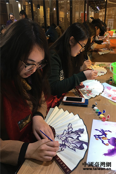 兩岸青年親身體驗繪制折扇。(中國臺灣網 王亞靜 攝)