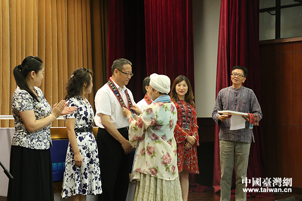 亞磊絲·泰吉華坦代表臺灣布農族部落為推動合作項目多位嘉賓授予勳帶,感謝他們為布農部落文化做出重要貢獻。(中國臺灣網 普燕 攝)