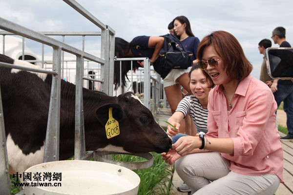 臺灣青年在紅星乳業草場與奶牛親密互動。(中國臺灣網 陳文韜 攝)