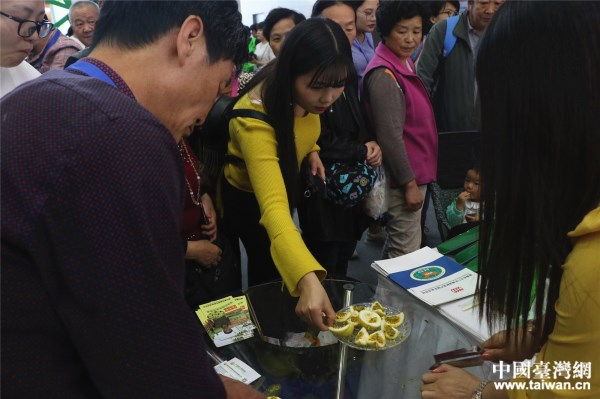 展區現場,參展觀眾品嘗黃金百香果。(中國臺灣網 郜利敏 攝)