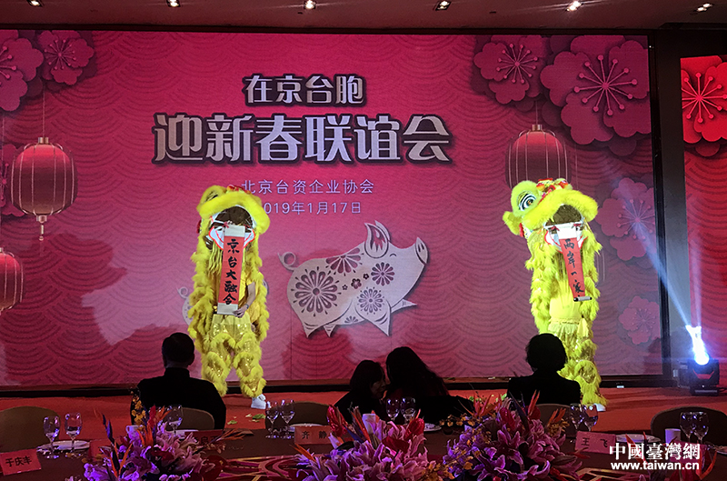17日,由北京臺資企業協會主辦的2019在京臺胞迎新春聯誼會在京舉行。圖為聯誼會開場節目《祥獅獻瑞》。