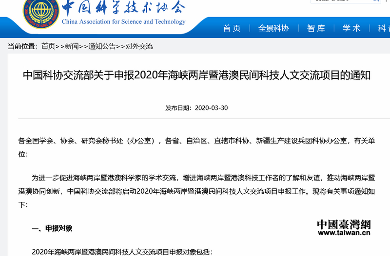 中國臺灣網4月1日訊 據“中國科學技術協會”官網報道,中國科協交流部將面向各全國學會、協會、研究會秘書處(辦公室),各省、自治區、直轄市科協、新疆生產建設兵團科協辦公室等有關單位,啟動2020年海峽兩岸暨港澳民間科技人文交流項目申報工作。