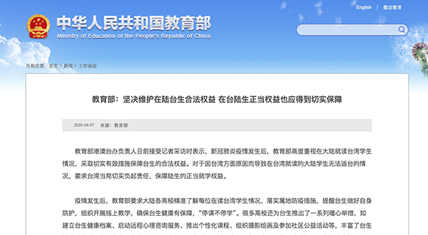 教育部:敦促臺灣當局立即改變針對陸生的不合理限制
