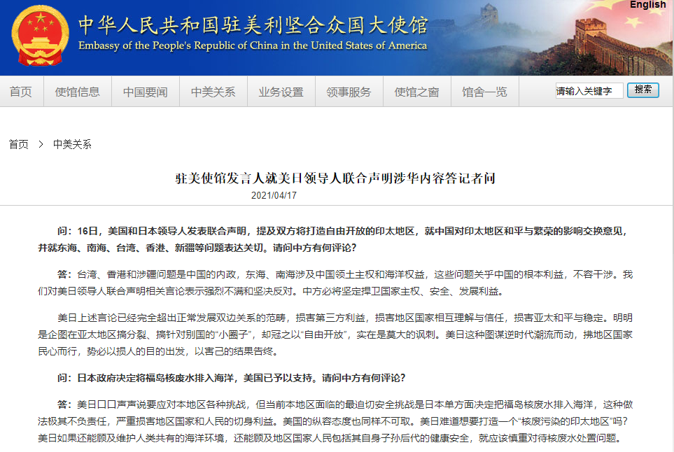 中國臺灣網4月17日訊 據中華人民共和國駐美利堅合眾國大使館官網消息,17日,中國駐美使館發言人就美日領導人聯合聲明涉華內容答記者問。