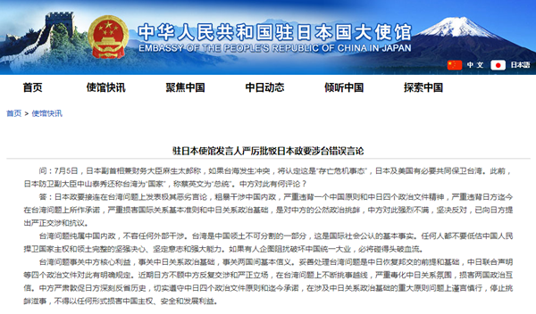 日本政要接連在臺灣問題上發表惡劣言論 中使館:公然政治挑釁