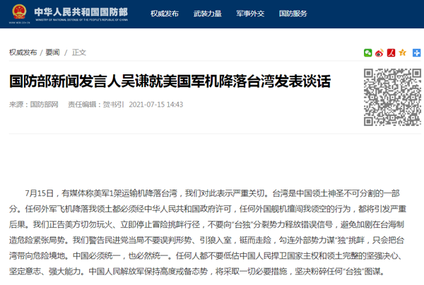 談話表示,7月15日,有媒體稱美軍1架運輸機降落臺灣,我們對此表示嚴重關切。臺灣是中國領土神聖不可分割的一部分。任何外軍飛機降落我領土都必須經中華人民共和國政府許可,任何外國艦機擅闖我領空的行為,都將引發嚴重後果。我們正告美方切勿玩火、立即停止冒險挑釁行徑,不要向“臺獨”分裂勢力釋放錯誤信號,避免加劇在臺海制造危險緊張局勢。我們警告民進黨當局不要誤判形勢、引狼入室,鋌而走險,勾連外部勢力謀“獨”挑釁,只會把臺灣帶向危險境地。中國必須統一,也必然統一。任何人都不要低估中國人民捍衛國家主權和領土完整的堅強決心、堅定意志、強大能力。中國人民解放軍保持高度戒備態勢,將採取一切必要措施,堅決粉碎任何“臺獨”圖謀。(完)