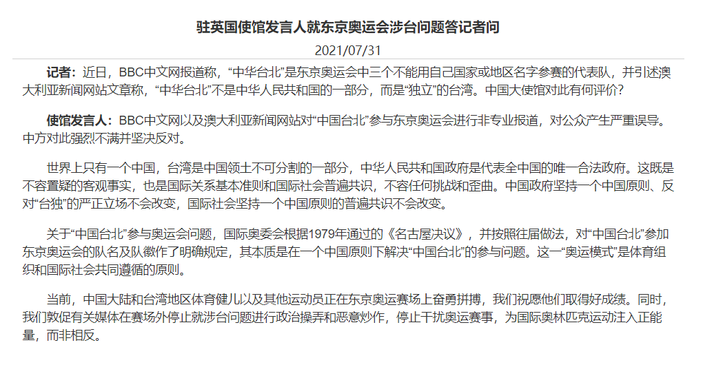 發言人表示,BBC中文網以及澳大利亞新聞網站對“中國臺北”參與東京奧運會進行非專業報道,對公眾產生嚴重誤導。中方對此強烈不滿並堅決反對。