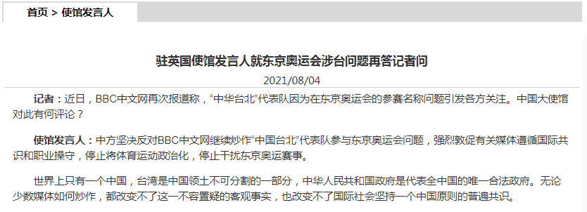 中國臺灣網8月4日訊 據中國駐英國大使館網站4日消息,駐英國使館發言人就東京奧運會涉臺問題再答記者問。針對有記者問:近日,BBC中文網再次報道稱,“中華臺北”代表隊因為在東京奧運會的參賽名稱問題引發各方關注。中國大使館對此有何評論?