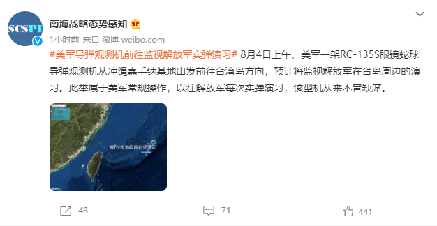 中國臺灣網8月4日訊 據南海戰略態勢感知官方微博披露,今日(4日)上午,美軍一架RC-135S眼鏡蛇球導彈觀測機,從衝繩嘉手納基地出發前往臺灣島方向,預計將監視解放軍在臺島周邊的演習。此舉屬于美軍常規操作,以往解放軍每次實彈演習,該型機從來不曾缺席。