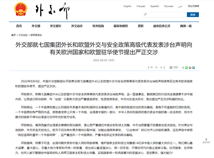 2022年8月4日,中國外交部副部長鄧勵奉命就七國集團外長以及歐盟外交與安全政策高級代表發表涉臺消極聲明緊急召見有關歐洲國家和歐盟駐華使節,提出嚴正交涉。