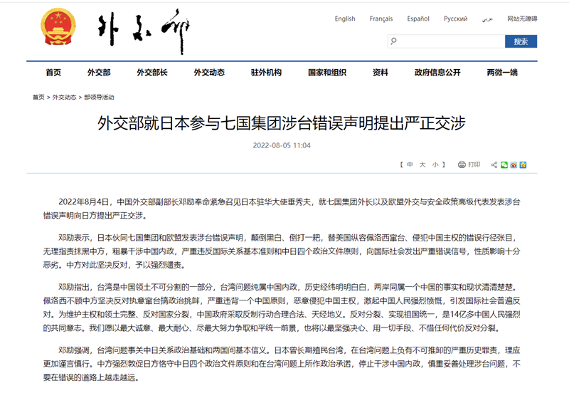 2022年8月4日,中國外交部副部長鄧勵奉命緊急召見日本駐華大使垂秀夫,就七國集團外長以及歐盟外交與安全政策高級代表發表涉臺錯誤聲明向日方提出嚴正交涉。