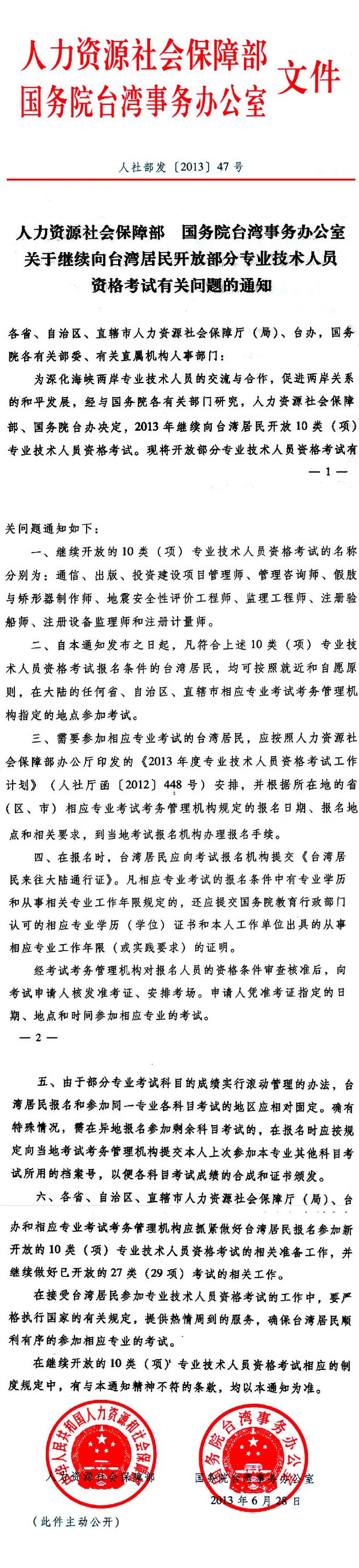 關于繼續向臺灣居民開放部分專業技術人員資格考試有關問題的通知