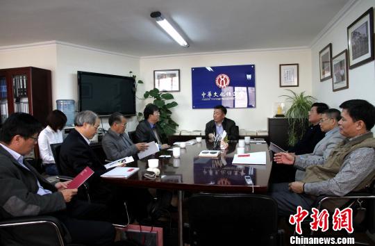 3月26日,臺灣藝術大學校長謝顒丞(左五)一行,在深圳匯德豐集團董事長藍海(右二)等人的陪同下,拜會中華文化促進會,就兩岸如何共同傳承中華文化等議題與中華文化促進會常務副主席王石(右四)進行交流。 陳小願 攝