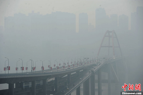 10月8日,輕軌和車輛穿梭于霧霾籠罩的城市中。霧霾籠罩著重慶主城區,長江兩岸能見度極低,只能隱隱約約看到對岸的建築。圖為霧霾籠罩著大橋。陳超 攝
