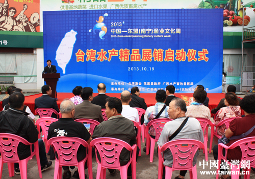 中國臺灣網10月21日南寧消息 10月19日上午,臺灣水產精品展銷專區啟動儀式在廣西水產畜牧業名特優產品展銷展示中心的小廣場隆重舉行。國臺辦、廣西臺辦、臺灣漁會參訪團、廣西水產畜牧獸醫局、各市水產畜牧獸醫局及直屬單位、廣西大學動物科技學院、廣西漁業龍頭企業、新聞媒體等260人參加了啟動儀式。