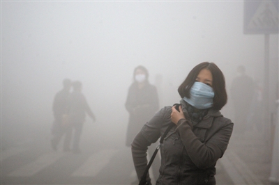 21日上午的哈爾濱,由于空氣污染濃度過高,呼吸有些沉重。匆匆而過的行人中有人戴著口罩,有人拿著胸前的絲巾捂住鼻子,近處的樓房、路牌在濃霧中有些模糊,往日數公里外就能看到的標志性建築—龍塔(黑龍江省廣播電視塔)也“不知所蹤”。