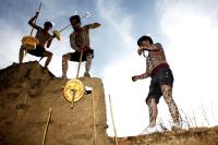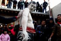 12月22日下午,居住在青海省黃南藏族自治州同仁縣年都乎村的土族民眾舉行“跳於菟”活動。在零下3攝氏度的低溫下,7名成年男子脫光上身,挽起褲腿,將燒過的煤灰涂抹于全身後,再用毛筆和墨水在身上畫上老虎圖案。隨後他們手握長枝,跳起他們認為能夠驅邪逐魔、祈求吉祥的“虎舞”。圖為“跳於菟”表演爬山牆壁進行表演。中新社發 胡貴龍 攝