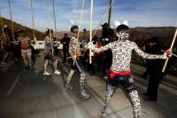 12月22日下午,居住在青海省黃南藏族自治州同仁縣年都乎村的土族民眾舉行“跳於菟”活動。圖為土族民眾身上繪虎紋後起舞。中新社發 胡貴龍 攝