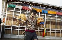 12月22日下午,居住在青海省黃南藏族自治州同仁縣年都乎村的土族民眾舉行“跳於菟”活動。圖為一名“於菟”表演者口含牛肉,雙手捧著土族特有的面餅。中新社發 胡貴龍 攝