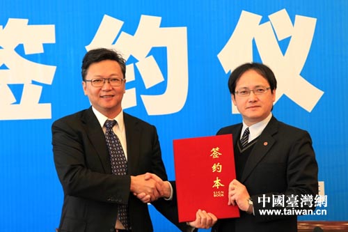 雲南省政府副秘書長、省臺辦主任、省博覽局局長李極明(左)與臺灣貿易中心副秘書長王熙蒙互換簽約文本。