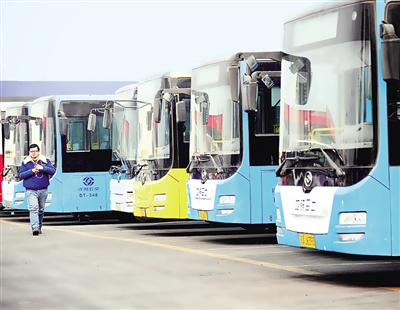 2月23日,一名沈陽市民從清潔能源環保公交車旁經過。據了解,今年沈陽5000輛公交車中清潔能源環保車達到1000輛。 張文魁攝(新華社發)