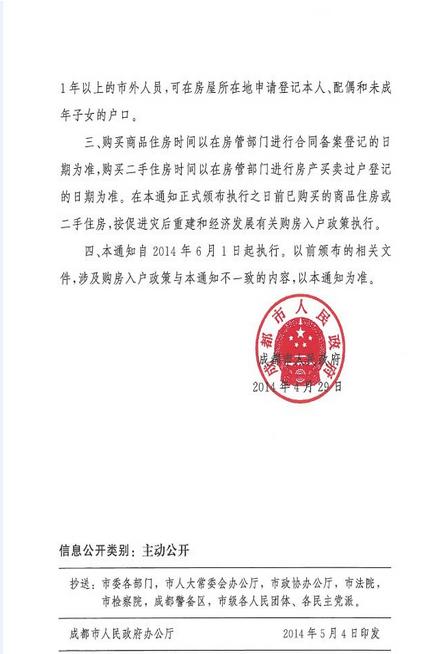這份成都市人民政府的文件表示,為應對“5·1 2”汶川特大地震災害和國際金融危機衝擊,我市出臺了災後購房入戶政策有關規定。現災後重建工作已基本完成,為使戶籍人口增長與經濟社會發展相適應,現就完善購房入戶政策有關事宜通知如下。