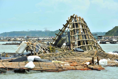 廣西欽州市欽南區欽州港被臺風吹壞的蠔排(7月20日攝)。新華社發