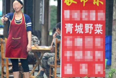 昨日中午,青城山鎮上的多家農家樂老板站在街邊招攬生意。在他們身旁,巨大的招牌上寫著各種特色菜品,其中“青城野菜”作為店家極力推薦的菜品,被寫在了顯眼的位置。