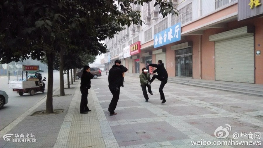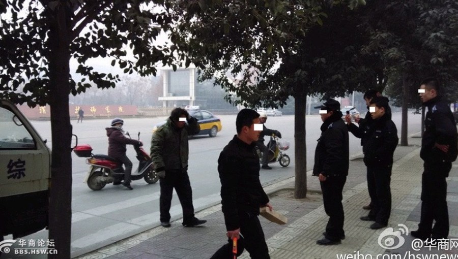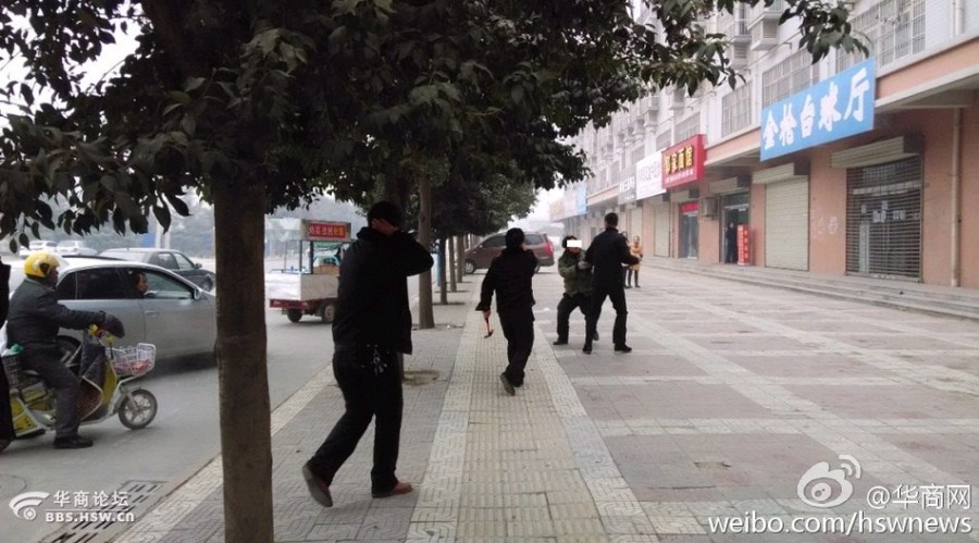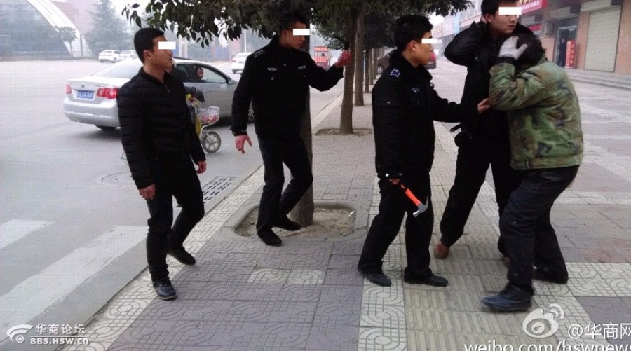 網傳照片顯示,四五個身穿黑色制服的執法隊員在圍追一名帶白手套的農民工。當時,一名執法隊員捂著自己的後腦,另一名執法隊員手里拎著錘子,有執法隊員對農民工踢踹,後者最終被按倒在地,頭部受傷。