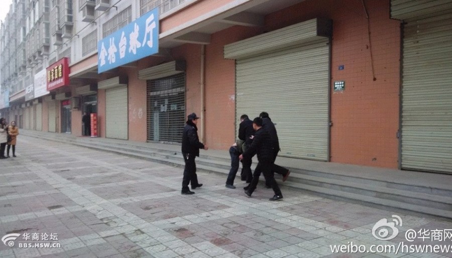 圖為事發現場,執法人員將民工打到在地。