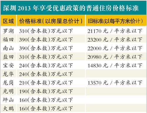 昨日,深圳市規劃國土委在官網發布公告,從2013年9月1日起調整深圳享受優惠政策普通住房標準。新標準改變了以前按每平方米均價核算的做法,調整為按照單套商品住房總價進行核算,並以十個行政區為劃分單位。相比過去兩年的價格標準,標準大幅上調。