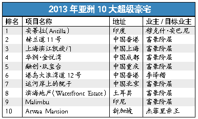2013亞洲10大豪宅是由世界經理人集團、《世界企業家》雜志主辦,世界地產研究院聯合編制並發布的。2013(第四屆)《亞洲10大超級豪宅》排行榜于2013年9月28日在香港揭曉,印度首富價值10億美元的摩天宮“安蒂拉”繼續蟬聯第一,泰禾集團旗下的“運河岸上的院子”排位第七,是北京唯一入選項目。泰禾集團相關負責人一再強調“絕未花錢買獎”。