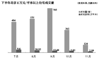 11月過去將半,全市尚無一個超過4萬元/平方米的項目開盤。剛剛過去的10月,全市僅有望京金茂府一個高端項目開盤,新增供應量僅30套。