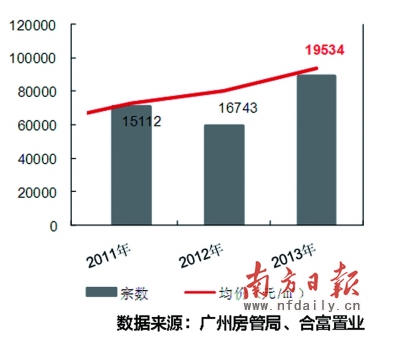 據廣州國土資源與房屋管理局數據顯示,2013年廣州二手住宅登記交易近8.9萬宗,727.2萬㎡,較2012年的增幅均在五成左右。據合富置業統計,2013年廣州二手住宅實際成交量較2012年增加兩成以上。