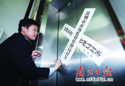 執法人員現場查封不合格電梯。魯力 攝