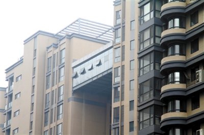 3月6日,西安南郊一小區內的“空中走廊”。該小區某業主同時購買了相鄰兩棟高層住宅的相同樓層,然後圖省事在這兩戶住宅之間修建了一座封閉的走廊,被當地民眾稱為“最牛天橋”。記者昨日了解到,西安市規劃局碑林分局已對該市一小區兩座高樓之間的“空中走廊”向開發商下達了《限期整改通知書》,要求對違建進行拆除。田進 攝