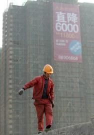 3月16日,一位工人搖搖晃晃走在杭州“天鴻·香榭里”的巨幅降價廣告前。新華社發