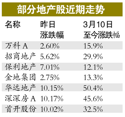 受放開限購傳聞影響,昨日,房地產板塊整體漲幅達到3.25%,四大龍頭股攜手大漲,領漲兩市,華遠地產、深深房A、首開股份等9只地產股漲停。港股內房股也普遍升逾3%。