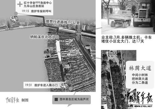 回憶起3月19日事發當晚的情形,謝華說:“救護車的醫護人員說,他們在19時15分接到了呼叫。”派出救護車的,是北京市紅十字會999急救中心設在九華山莊的急救站。