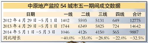 隨著5月的到來,雖然五一有多盤源入市,但是北上廣深的表現仍然不佳。中原地產研究中心統計數據顯示,五一期間54城市合計住宅簽約套數為9887套,同比2013年同期的14642套下調了32.5%。其中一線城市三天合計簽約1046套,同比下調了40%,超過平均水平。