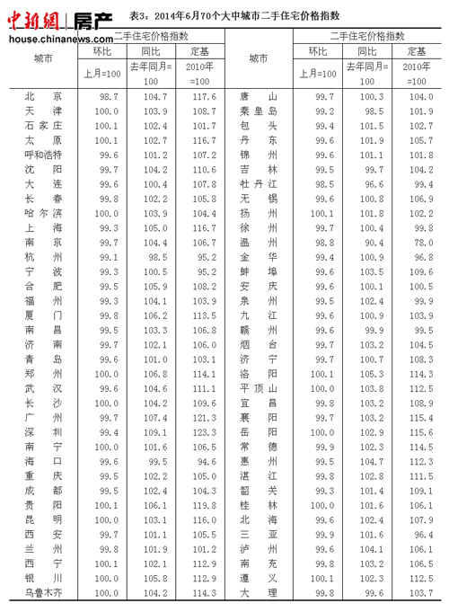中新網7月18日電 6月全國房價繼續延續下跌態勢。國家統計局18日發布的“2014年6月份70個大中城市住宅銷售價格變動情況”顯示,6月新房價格環比下降的城市增至55個,上漲城市降至8個。